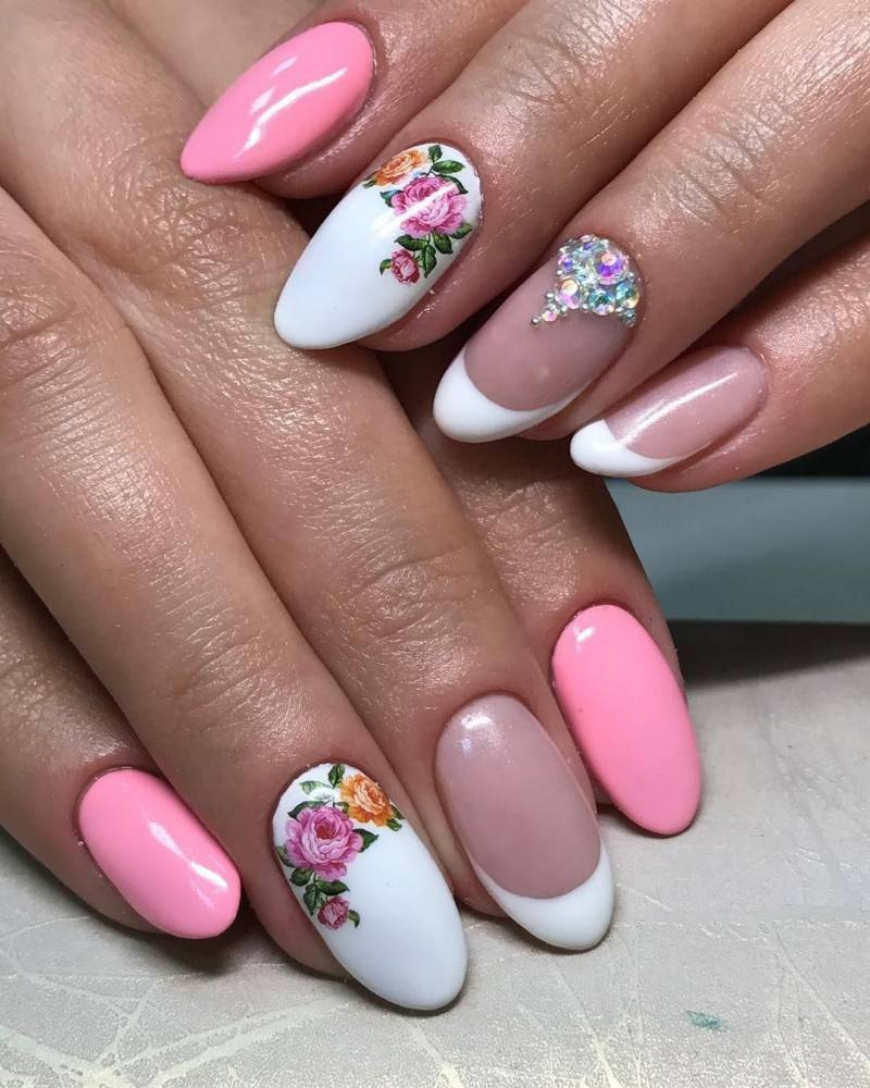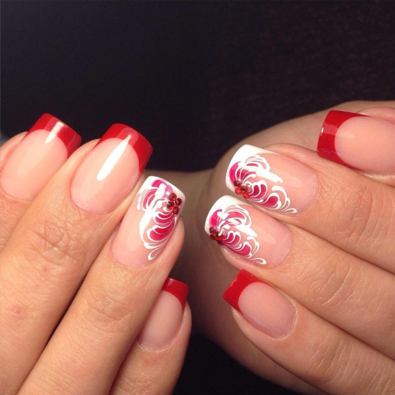 На данный момент существует масса разнообразных рисунков, каждый из которых имеет свое очарование и женственность. Рисунки можно наносить любым цветом, но мастера часто добиваются красивого контраста, которого достигают отличными друг от друга цветами. Например, ногтевое ложе выкрашено в розовый, а рисунок красный.