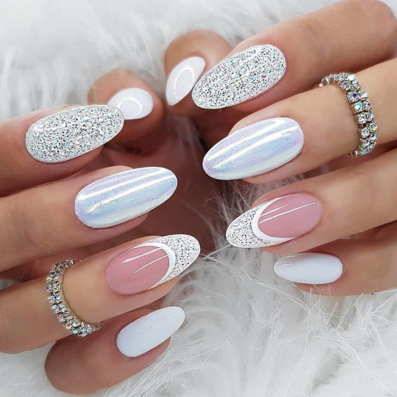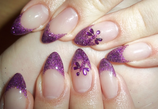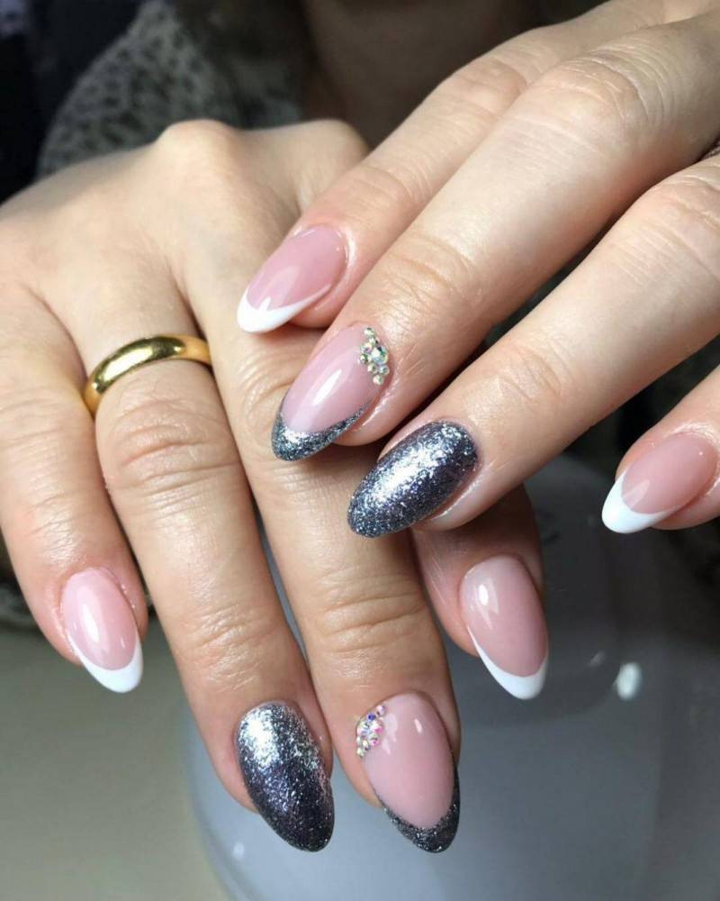 Изобилие блесток привело к тому, что с помощью них можно создавать любые маникюры. Нередко мастера прибегают к использованию блесток, вместо обычного лака для выделения зоны улыбки. Это достаточно необычный и очень привлекательный метод создания праздничного и торжественного маникюра.