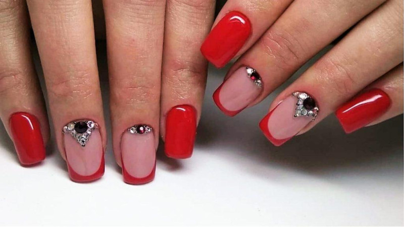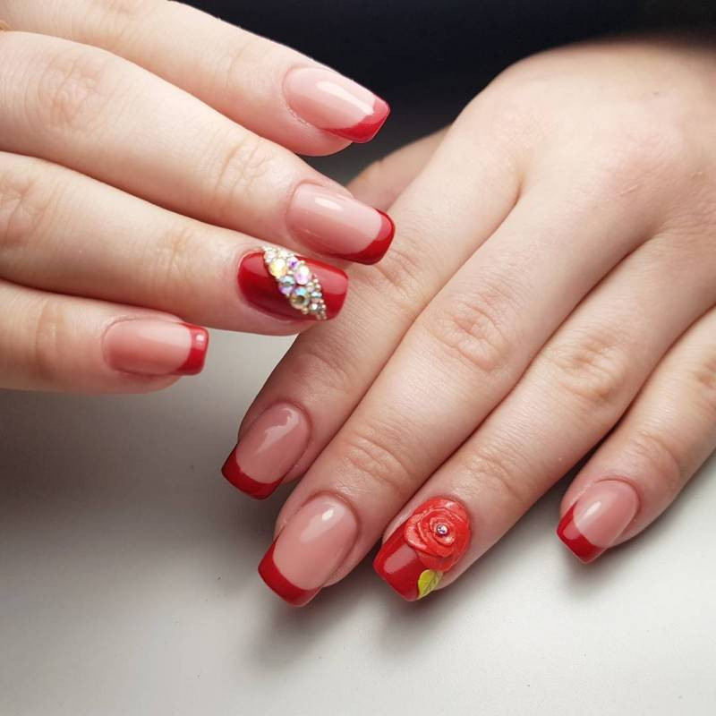 Красный френч или френч с элементами красного создает уникальный дизайн маникюра. Он страстный, яркий и необычайно притягательный. Красный красиво сочетается с черным, белым, золотом, серебром, фиолетовым, желтым и зеленым. Мастера часто используют его для создания рисунков цветов, которые могут быть переходящими.