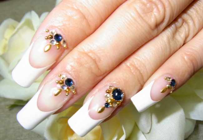 После того, как лак засохнет, сверху могут поместить любой декоративный элемент, на ваше желание и усмотрение специалиста. Самый часто выбираемый — стразы. Стразы могут помещаться у лунки ногтя, на кончике, в центре, покрыть всю площадь или же изобразить любой узор. Традиционно цвет стразов белый, блестящий, но вы можете выбрать любой другой цвет.