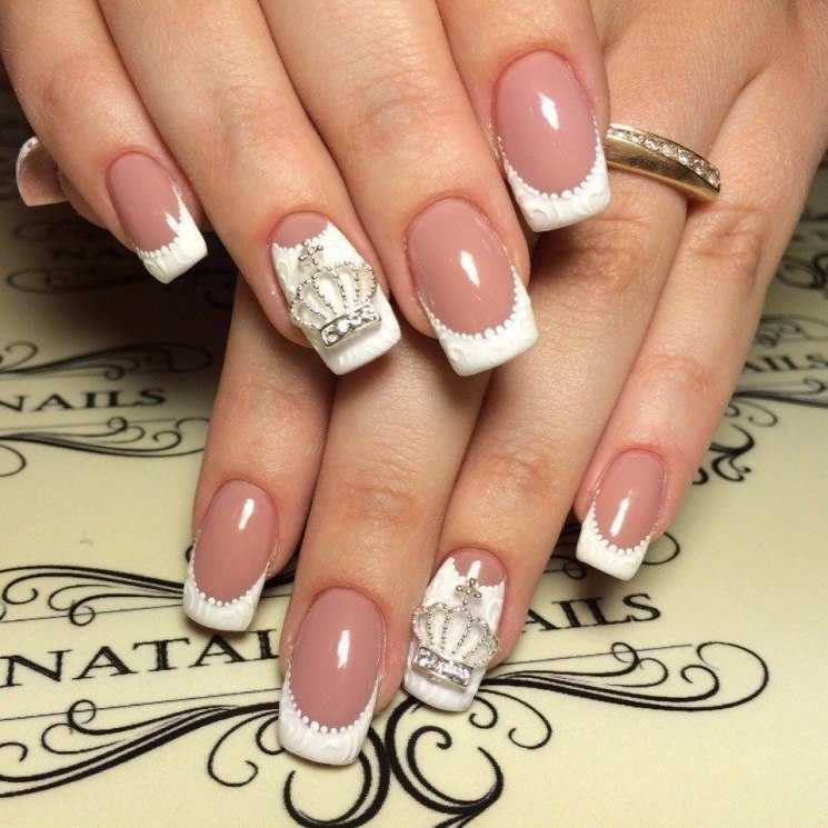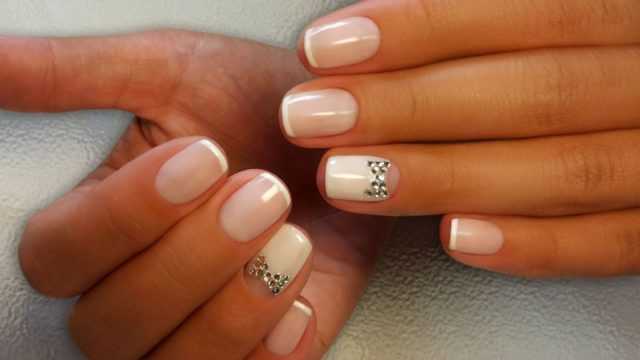 Замечательным декором для стандартного французского маникюра являются стразы и слайдеры. Стразы с легкостью придают френчу уникальности и дороговизны. Такой маникюр подойдет для светского раута или вечеринки. Стоит учитывать, что на длинных нарощенных ногтях крупные стразы смотрятся лучше, на натуральных же могут оставаться повреждения после их снятия. Чтобы данной ситуации не происходило, лучше выполнить маникюр гель-лаком, а уже потом добавить стразики. Тогда ноготки не повредятся.