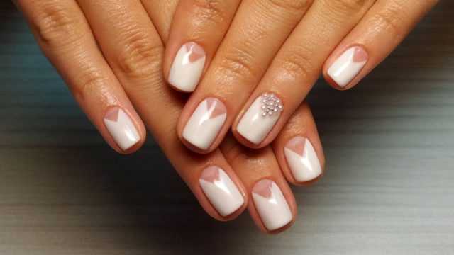 Геометрический дизайн не уступает в популярности другим новомодным видам маникюра, и этот тренд не мог не коснутся френча. Очень востребован стал треугольный френч, который подходит как для ногтей прямоугольной формы, так и для формы ногтей миндаль или треугольник. Треугольный френч можно дополнить небольшими орнаментами, полосками, рисунком оригами или чем-то еще из соответствующей тематики.
