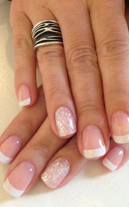 К примеру, разноцветный или жемчужный пигмент, который нанесён поверх оформления, даже в комбинации с бесцветной основой, делает классический френч более интересным, свежим и невесомым.