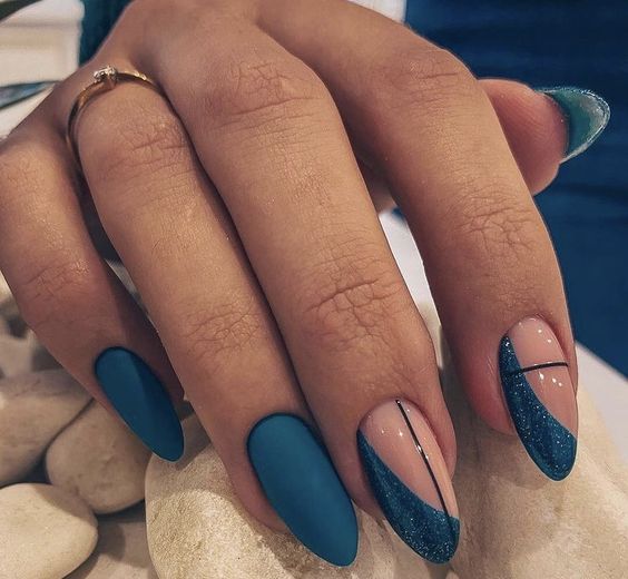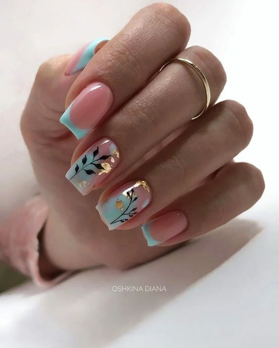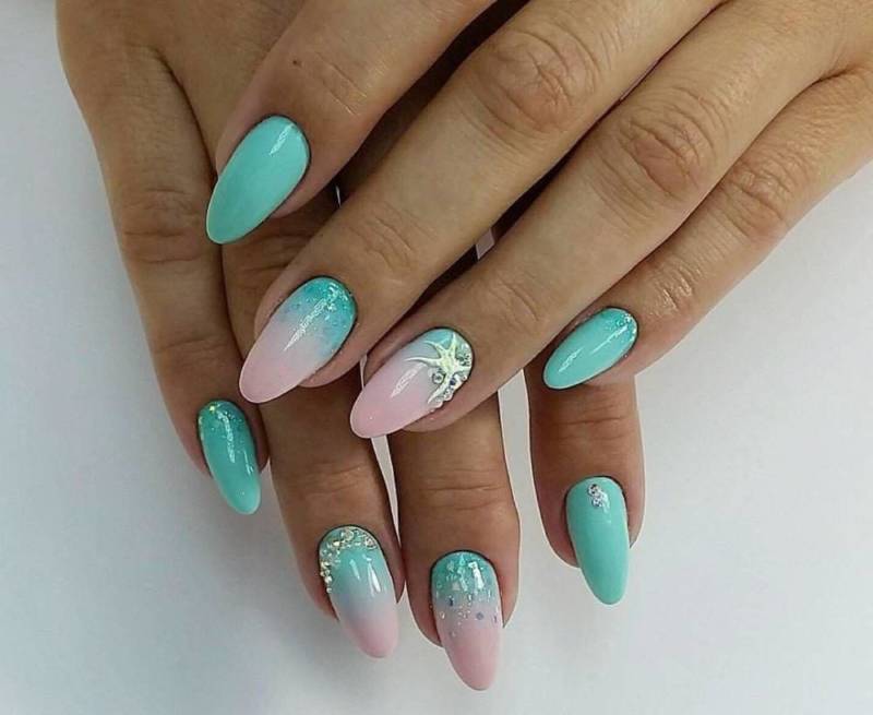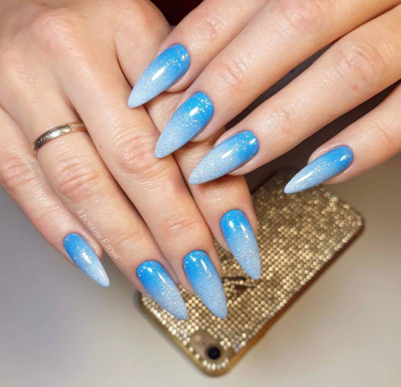 Великолепно выглядит нежно-голубой френч с блестками. Такой дизайн отлично впишется в летний образ, особенно если он дополнен узорами морской тематики. Голубой цвет также часто используется в зимних нейл-артах для имитации инея и морозной свежести.