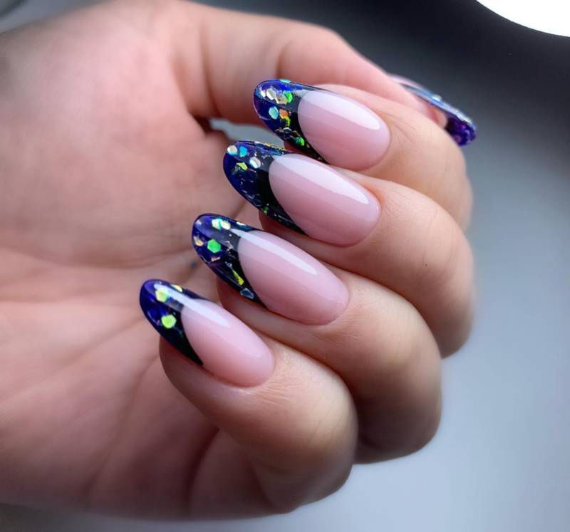 Амбертовая форма ногтей имеет овальную основу и квадратный кончик, что позволяет сочетать в дизайне элементы обеих форм. Френч маникюр с блестками для амбертовых ногтей может быть выполнен в нескольких вариантах, в том числе с использованием градиентного перехода блесток от темного к светлому тону, или с использованием контрастных цветов и форм.