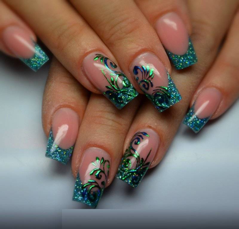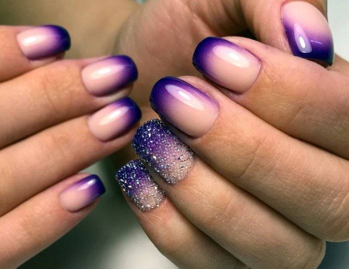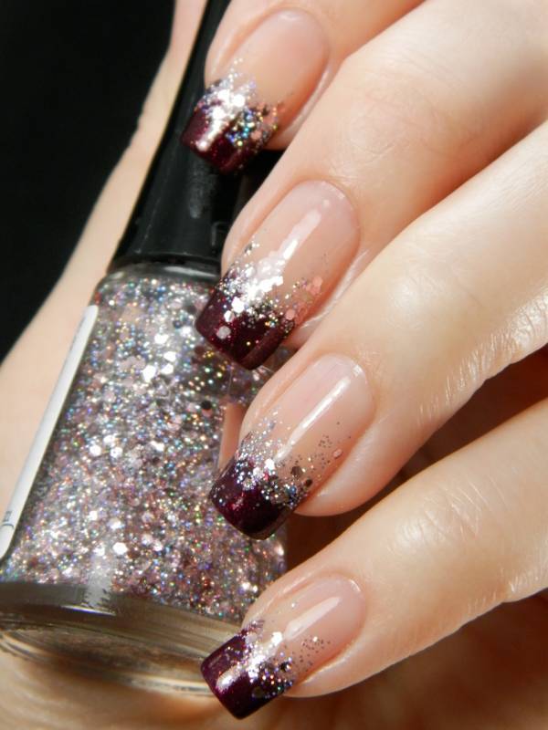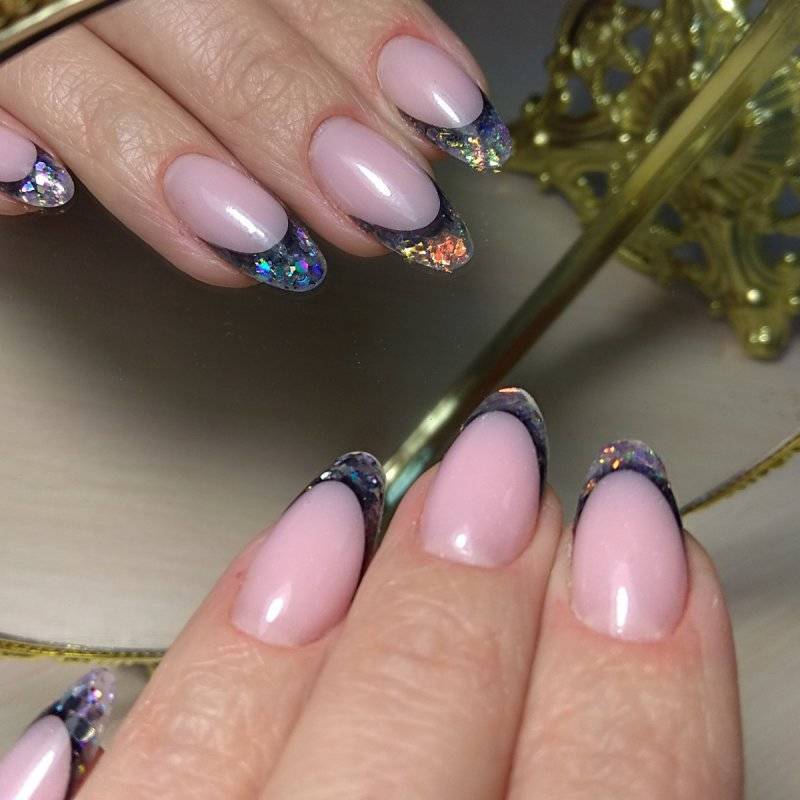 Этот вариант уже несколько лет удерживает лидирующую позицию во французском маникюре. Примечательно, что такой дизайн можно сделать самостоятельно. Для этого необходимо правильно обработать ногтевою пластину, сделать гигиенический маникюр и выбрать цвет. Чаще всего используется техника омбре, когда глиттер или втирку растягивают от свободного края к середине. Некоторые ноготки можно выделить стразами разного размера.