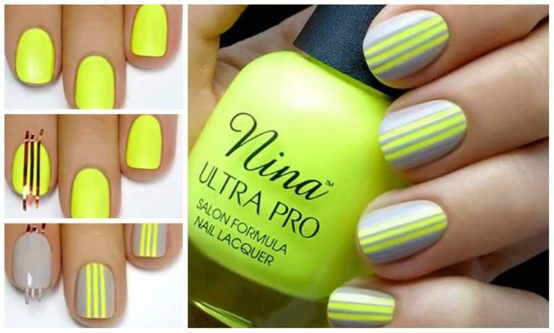 Неоновый nail art оценят яркие и активные девушки, в чьем гардеробе присутствуют сочные краски. Подобрать можно любые цветовые сочетания, мы предлагаем вам повторить серо-желтый нейл-дизайн. Каждая девушка сможет повторить эту схему своими руками: