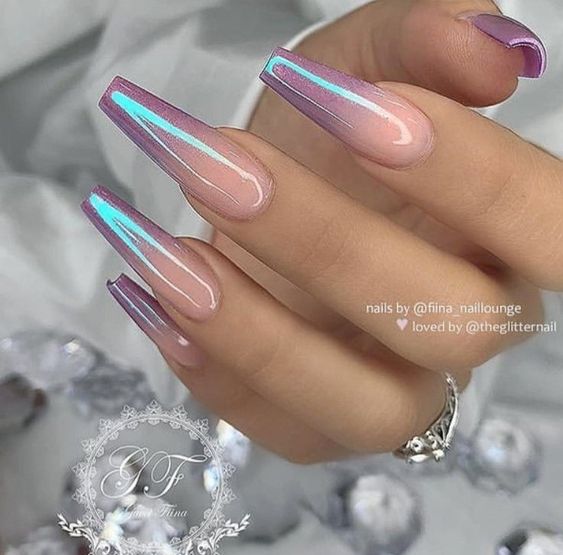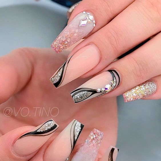 - Длинные ногти позволяют использовать крупные блестки и глиттер, чтобы создать яркий и эффектный образ.