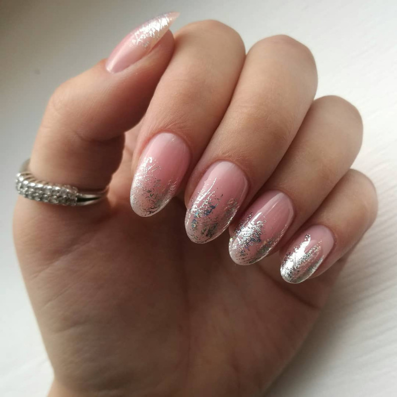 Мастера ногтевого сервиса советуют обратить внимание на розовый френч с геометрией, где «улыбка» подчеркивается серебристой фольгой или блестящим лаком. Такое оформление станет актуальным решением для праздничных мероприятий, торжеств или свадеб
