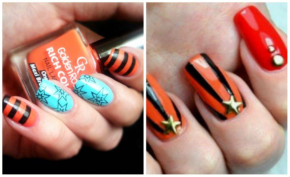 Например, используя черный и оранжевый лак и ленту можно исполнить тематический дизайн к Дню победы,- 10 минут и у вас георгиевская лента на ногтях.