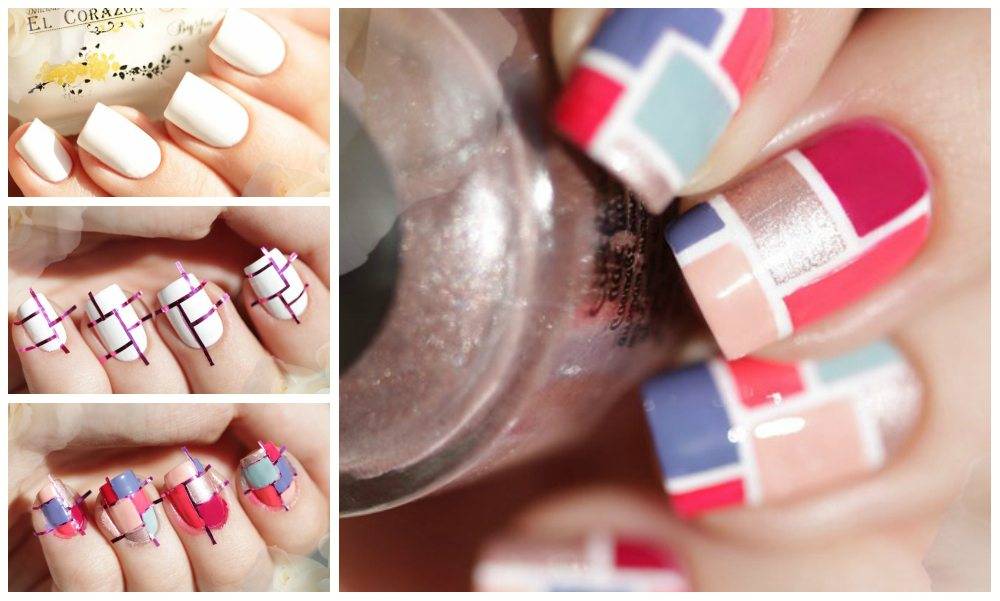 Возьмите клейкие ленточки, разрежьте их на небольшие кусочки и наклейте так, как показано на фото ниже. Ноготь должен быть поделен на разные по размеру прямоугольники.