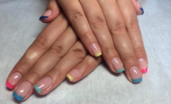 Разнообразить привычную классику помогут яркие тона и оттенки. Украсьте свободный край любым понравившимся цветом и получите заряд позитива и бодрости не на один день. Такой вариант френча идеален для летнего периода. Вариацией классики может быть не только игра с цветом, но и формой. Линия улыбки в виде заостренной воронки визуально удлинит ноготь.