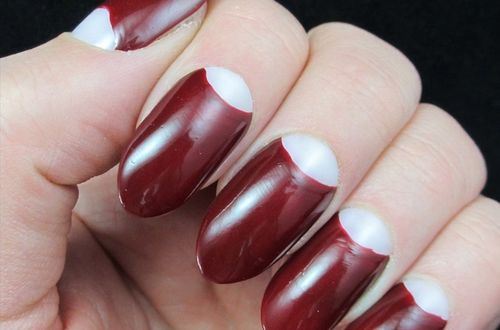Здесь всё ещё проще. Пластырь повторяет форму улыбки и поможет справиться с ее прорисовкой. Достаточно на хорошо высушенную поверхность цветного ногтя наклеить пластырь дугообразной стороной. Затем останется только закрасить пространство белым лаком, и френч готов!