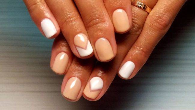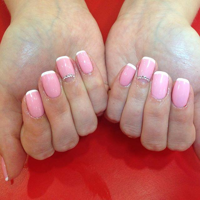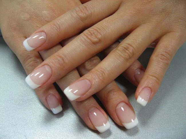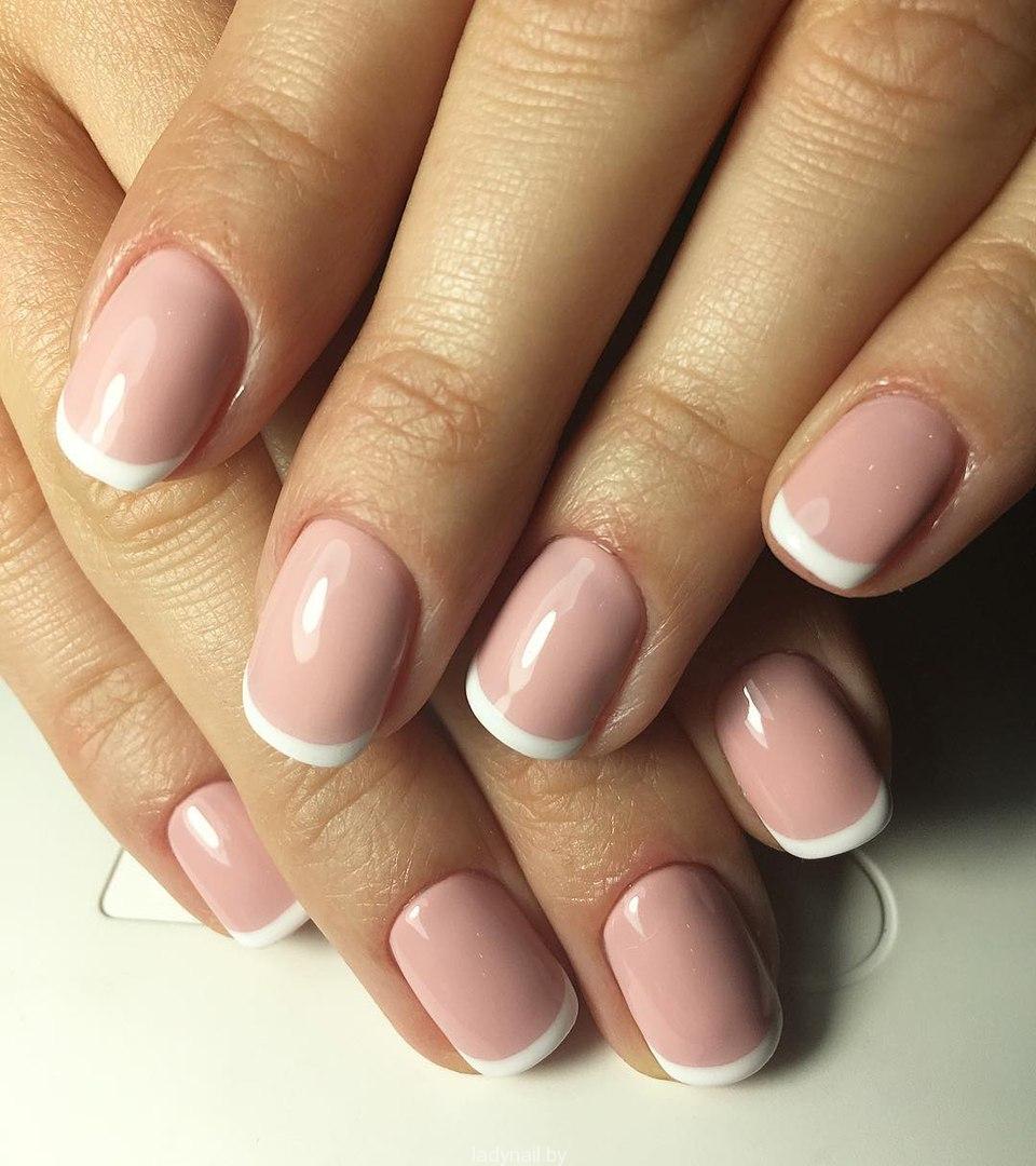 Элегантный и строгий маникюр, который едва ли выйдет из моды. Нейтрального розового или персикового цвета ноготь и аккуратная белая линия улыбки украсят пальчики как молодой девушки, так и более зрелой женщины. Линии шеллака на ногтях с французским дизайном должны быть идеальными.
