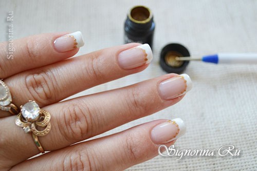 6) Теперь с помощью золотой краски и дотса ставим точки вдоль линии френча. Можно делать их одного размера или от большей точки к меньшей. Всё на ваш выбор.