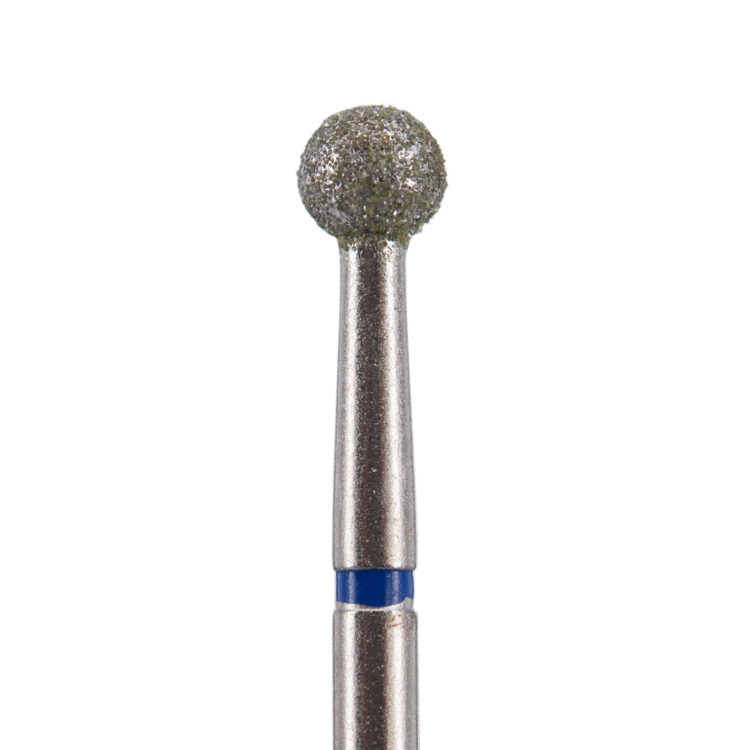 Шарообразная насадка имеет синюю и красную насечку. Фрезой небольшого диаметра снимают птеригий, среднего – кутикулу. Кроме того, такой формы насадку используют для срезания заусенцев и обработки боковых валиков.