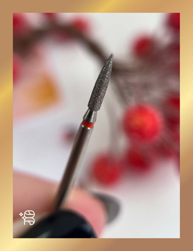 Очень травматичная насадка, которой осторожно нужно пользоваться новичкам. Из-за резких краев большой риск повредить кутикулу, поэтому рядом с кутикулой лучше работать насадкой с округлым краем