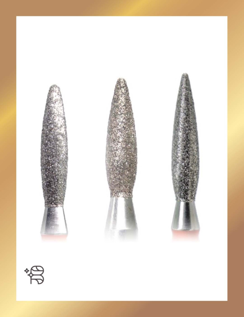Фрезой такой формы удобно работать с боковыми валиками. Крупные насадки предназначены для наружной работы, узкие и тонкие – для обработки внутренней части кожи у ногтей.