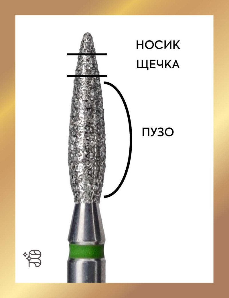 Фаворит многих мастеров — «ПЛАМЯ» и «ИГЛА». Две похожие фрезы, однако имеют разницу в форме. Форма фрезы для маникюра делится на 3 части: носик, щечка и пузо. Пузо фрезы пламя имеет округлую форму, игла — прямую; в этом их основное отличие.