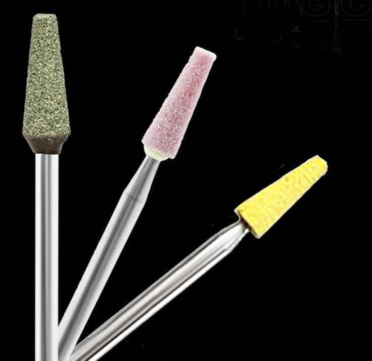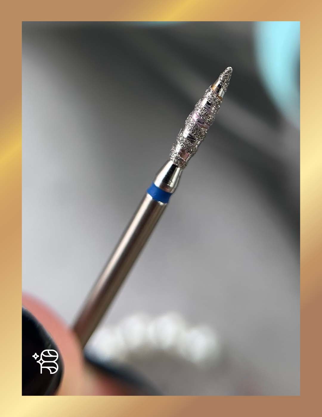 Это самый популярный инструмент для раскрытия и поднятия кутикулы для обработки пространства под ней и среза кожи. Алмазный или корундовый конус не травмирует покровы. Насадку нужно держать под прямым углом, чтобы образовалась «юбочка» кутикулы.
