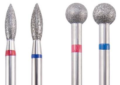 Диаметр таких фрез должен быть минимум 2,3 мм, иначе фреза может погрузиться слишком глубоко в ткани, как бор, и травмировать их. Самой простой моделью является шар и на фото ниже видно, что он как бы вписан и в другие модели. Здесь функциональность зависит от того, насколько удобно срезать кутикулу максимально широкой частью фрезы и насколько быстро можно зашлифовать боковые валики.