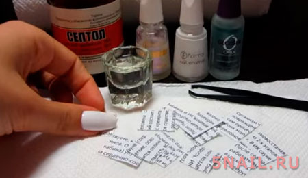 - Получение оттиска газеты. Кусочек с текстом аккуратно подцепляется пинцетом и опускается в спирт (или заменяющую его жидкость) примерно на 15 секунд. После вынимается и помещается на ноготь. Для получения четкого принта стоит прижать газету ватным диском и подержать 6-7 сек. Все движения должны быть четкими и точными, чтобы не смазать печатный узор.