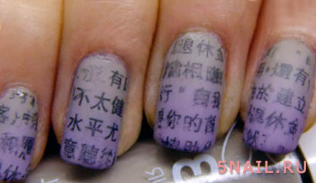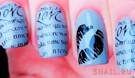 Маникюр с надписями на ногтях представляет собой отпечатки газетных надписей, переведённых на маникюр различными способами. Такой вариант оформления ногтей идеален для повседневного ношения