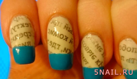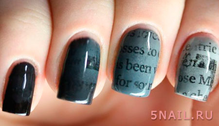 Для большей оригинальности можно использовать газеты, издаваемые на иностранных языках. Сверху можно нанести специальные наклейки, фольгу или дополнить маникюр художественной лепкой