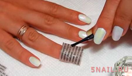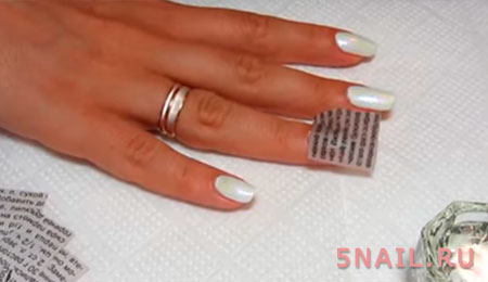 - Берут кусочек газеты и прикладывают к ногтевой поверхности.