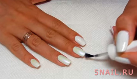 Наносим прозрачное покрытие для защиты ногтя. После того, как все надежно высохло, принимаемся красить ногти белым ими бежевым лаком. Обязательное условие аккуратного маникюра – полное высыхание каждого слоя!