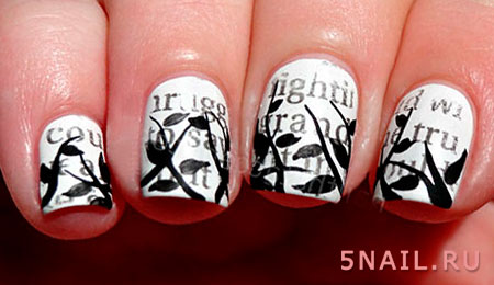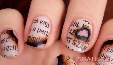 Такой газетный маникюр смотрится очень привлекательно, а самое главное оригинально, так как каждый ноготь имеет свой рисунок — кусочки текста никогда не повторяются.