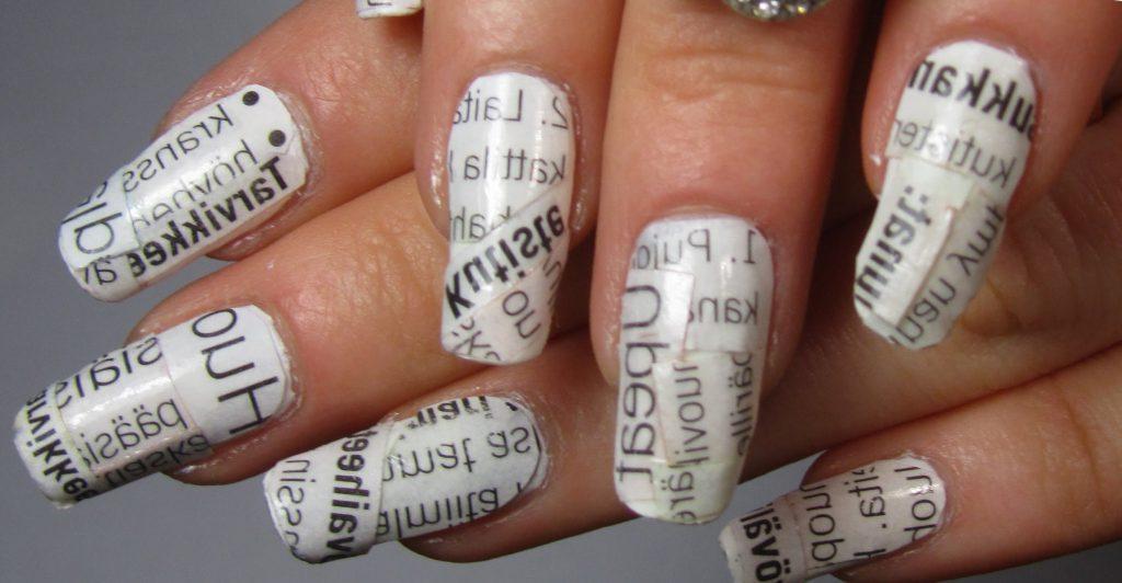 Сделать маникюр из газеты в домашних условиях не составит труда, при этом займет такая процедура совсем не много времени. Главное здесь — дождаться полного высыхания газетной бумаги, после чего зафиксировать ее прозрачным лаком.