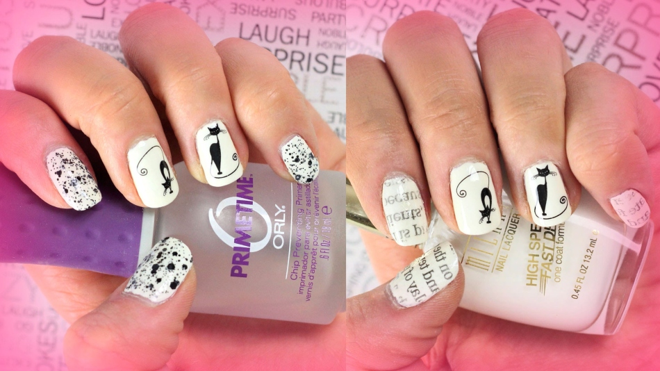 Оригинально выглядит газетный принт в негативном изображении, когда на чёрной основе отпечатан шрифт белого цвета. Для создания такого маникюра необходимо найти в печатных изданиях текст на тёмном фоне либо самостоятельно распечатать белые буквы на чёрной бумаге.