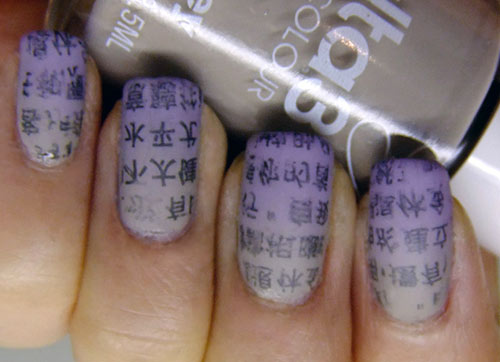 Градиентная техника в маникюрном деле надёжно закрепила свои позиции. В данном случае осуществляется плавный переход от одного оттенка к другому. При этом оттенки могут быть контрастными (например, белый — чёрный) или едва отличаться друг от друга. На таком фоне отпечатанный шрифт будет выглядеть оригинально.