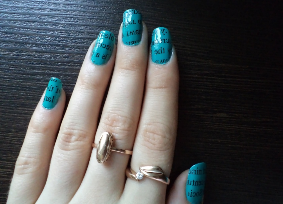 - Маникюр с помощью газеты подходит для повседневного или вечернего наряда. Чтобы придать нейл-арту контрастности, выполнить его можно не на прозрачном лаке, а на цветной эмали. На тёмном цвете прекрасно смотрятся разноцветные буквы, напечатанные принт в виде узоров, фигур.