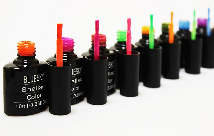 Благодаря наличию особой формулы компонентов такой лак приобретает способность светиться при воздействии на него ультрафиолета. При высыхании неоновый лак приобретает насыщенный цвет и сохраняет некоторое свечение. Данная палитра очень разнообразна и в нее входят как спокойные цвета, так и ярко-кислотные, неоновые цвета идеально подходят для лета и вечеринок. Имеет палитра Shellac Bluesky и еще одну необычную серию, имеющую зеркальный эффект.