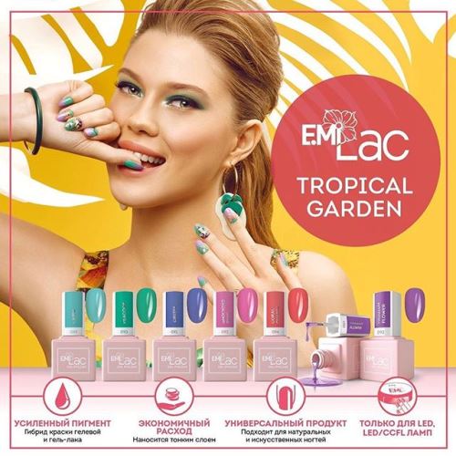 Для окрашивания нарощенных ногтей производитель предлагает коллекцию «Тропический сад». Гель-лаки насыщены двойным пигментом, благодаря чему их можно смело называть краской для ногтей. Коллекция представлена в модных оттенках текущего сезона.