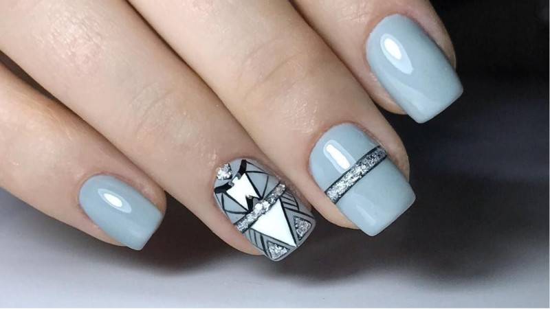 Геометрический дизайн поражает своим разнообразием. Популярны сегодня полоски (кстати, вертикальные зрительно удлиняют ногтевую пластину), уголки (выполненные у основания, они визуально делают форму ногтя более строгой и правильной). В качестве декора используют точки, которые сделают маникюр несколько игривым и беззаботным.