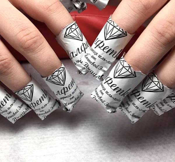 Секрет этого способа в том, что внутренняя сторона пакетика с салфеткой состоит из фольги. Поэтому при оборачивании пальца этим пакетиком, создается влажная теплая среда, которая способствует скорейшему отслоению гель-лака от ногтевой пластины.