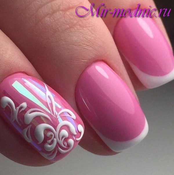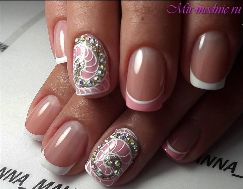 Не теряет своих позиций розовый френч. Обладательница французского маникюра в нежно-розовом цвете всегда выглядит женственно и элегантно. Например, невестам лучше выбрать стильный френч, когда края ногтей окрашены белым в виде неширокой полоски, а остальная часть ногтя – классически светло-розовая. Можно добавить стразы. Оттенок розового гель-лака подбирается в зависимости от цвета кожи: чем темнее и насыщеннее кожа, тем темнее гель-лак. Пастельные тона подойдут тем, у кого светлая кожа. Но в отличии от классического французского маникюра можно края френча оформить и ярко розовым.
