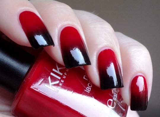 Это нечто более дерзкое и таинственное. Первая половина ногтя красится в черный с заступом за середину, а вторая — красным. Причем необходимо, чтобы красный так же накрывал ту часть черного покрытия, которая выступает за середину. Это создает характерное утолщение, что придает всем ногтям очень необычный вид. Плавный переход можно сделать с помощью губки или спонжа. Готовый градиент можно украсить стемпингом черного цвета.