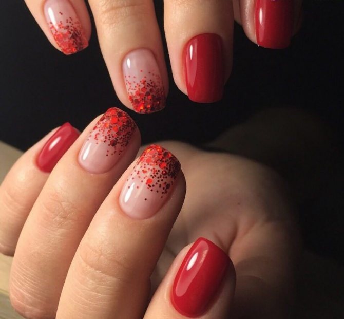 В красно-черном цвете шикарно выглядит градиентный маникюр. Выбирайте для дизайна гель-лаки с блестками, шиммером, глиттером и другими блестящими текстурами. Отлично смотрится соседство красного матового гель-лака и черного гель-лака с пайетками. Стоит учитывать, что оба цвета выглядят достаточно насыщенно и броско, поэтому не рекомендуется нагромождать ноготки геометрией, абстракцией, флористикой и другим декором. Оптимальный выбор – это однотонный маникюр с блестящим акцентом на 1-2 ноготках. Даже в торжественных образах такой маникюр будет смотреться уместно и сдержанно.