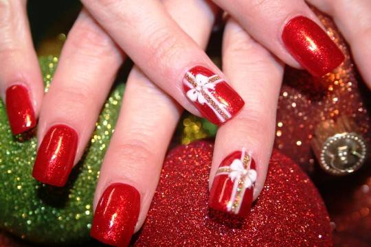 Белым гель-лаком на красном фоне обычно наносят узоры новогодней или рождественской тематики. Популярные мотивы – снежинки, олени, елочки.