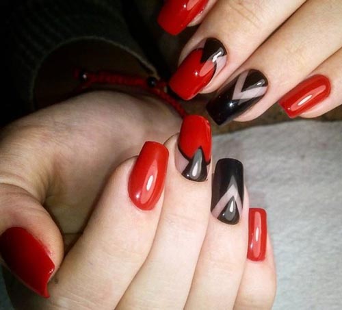 Сочетание красного и черного выглядит невероятно насыщенно и броско. Такой дизайн точно не останется незамеченным. Тандем черного и красного может быть использован для повседневный образов, но при условии, что выполнен однотонный маникюр. Черный и красный часто используется в торжественных образах. При этом желательно, чтобы дизайн ногтей гармонировал с украшениями или сумочкой.