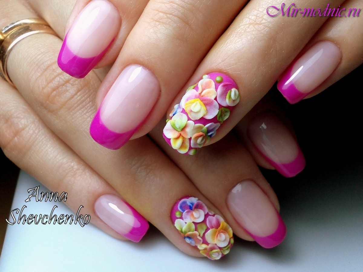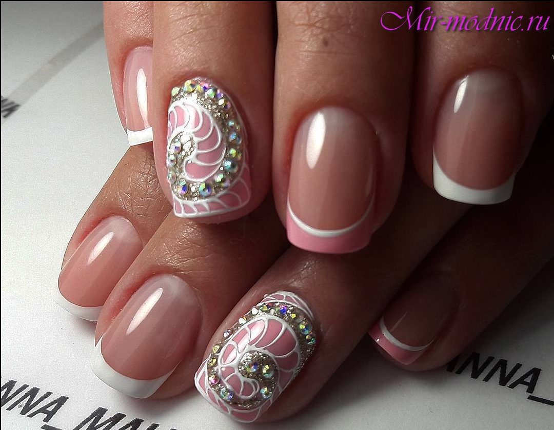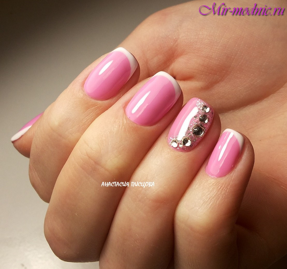 Не теряет своих позиций розовый френч. Обладательница французского маникюра в нежно-розовом цвете всегда выглядит женственно и элегантно. Например, невестам лучше выбрать стильный френч, когда края ногтей окрашены белым в виде неширокой полоски, а остальная часть ногтя – классически светло-розовая. Можно добавить стразы. Оттенок розового гель-лака подбирается в зависимости от цвета кожи: чем темнее и насыщеннее кожа, тем темнее гель-лак. Пастельные тона подойдут тем, у кого светлая кожа. Но в отличии от классического французского маникюра можно края френча оформить и ярко розовым.