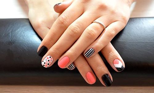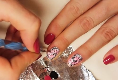 - На белой основе черным и розовым цветом в произвольном порядке поставьте точки разных размеров. Хотя этот рисунок гель-лаком на короткие ногти на видео получается очень быстро, не стоит спешить. Наносите каждую точечку спокойно, размеренно и очень густо. Так узор получится милым и аккуратным, особенно на коротких ногтях.