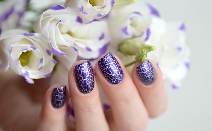 - Кракелюр. Чтобы сделать такой дизайн, понадобится 2 лака, обычно они продаются вместе. Первый продукт будет основой, чаще всего он имеет нейтральный цвет, второй лак обладает ярким оттенком, при нанесении он трескается, создавая необычный рисунок.