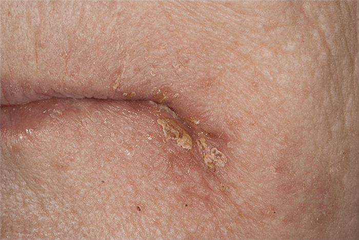 Рецидивы заболевания возникают на крыльях носа, красной кайме губ, деснах, внутренней поверхности щек и губ, лбу, веках. Самое распространенное место локализации вируса – уголки рта.