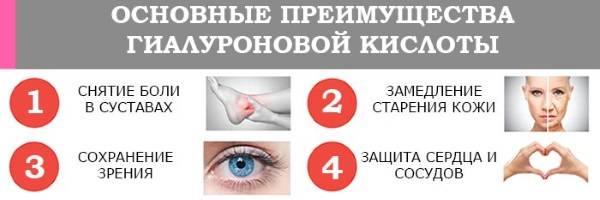 Преимуществами активной кислоты в капсулах является способ её применения. Ведь не нужно вводить препарат внутривенно или внутримышечно, достаточно принимать таблетки в удобное для вас время суток. Активным компонентом препарата является полимер. В одной молекуле может содержаться около 20 000 звеньев, которые состоят из дисахарида.