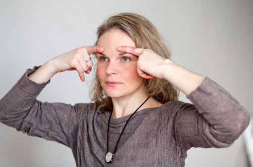 - Разместить подушечки больших пальцев над бровями и попытаться нахмуриться, сдерживая кожу. Сделать 8 повторений.